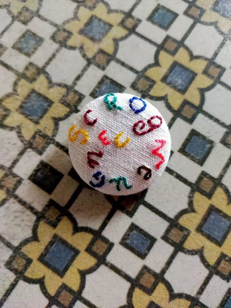 Broderie à la main sur tissu de seconde main avec du fil DMC.