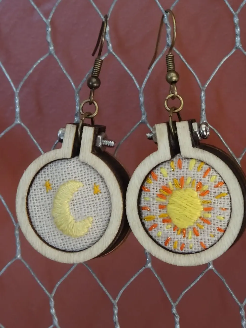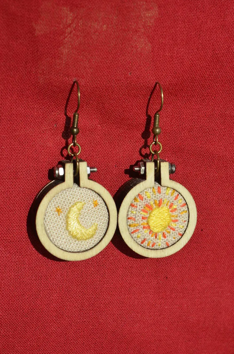 Boucles d’oreilles sur mini tambour brodées à la main dans mon atelier.