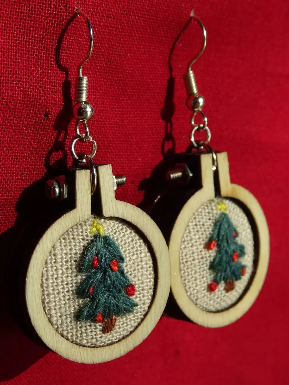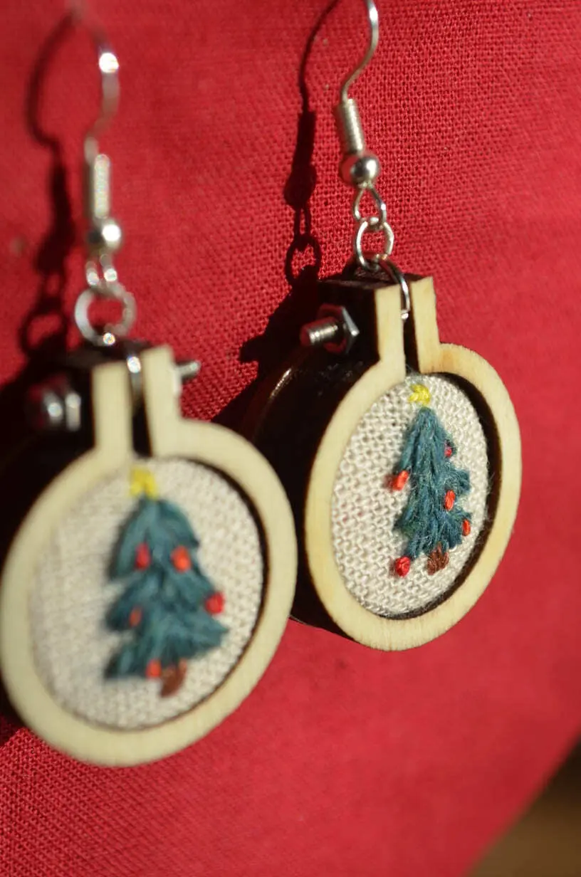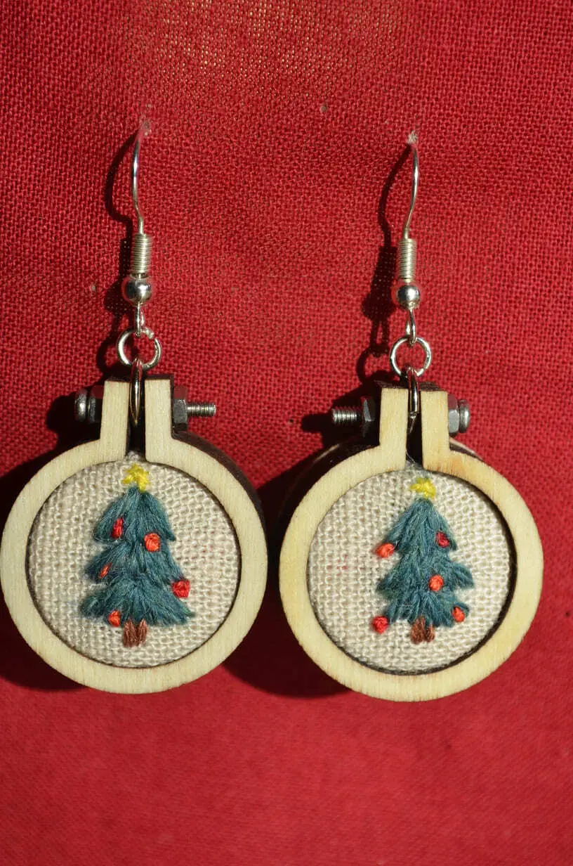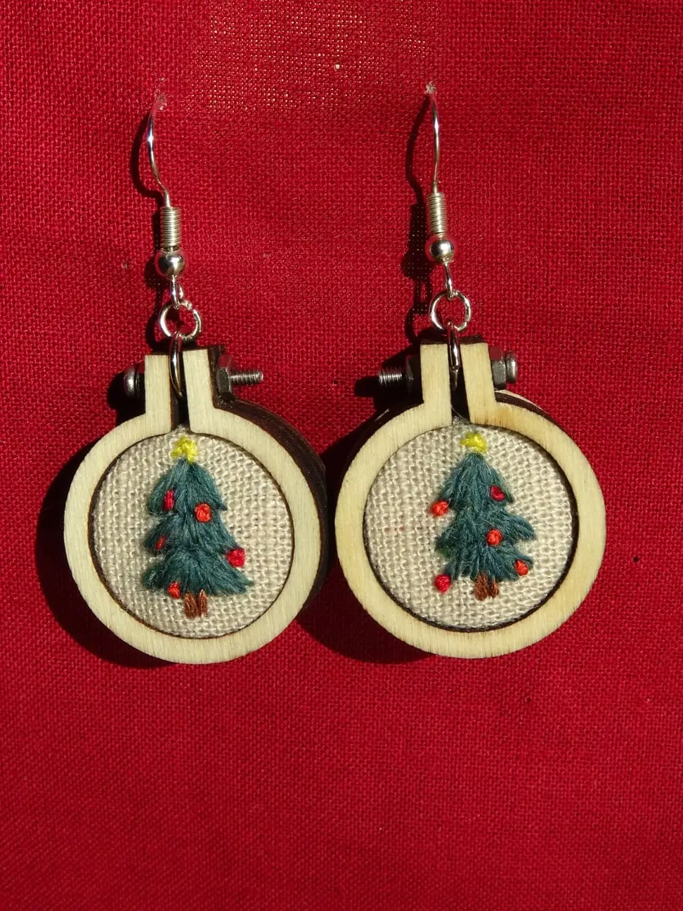 Boucles D’oreilles Sapin de Noël Broderie Main