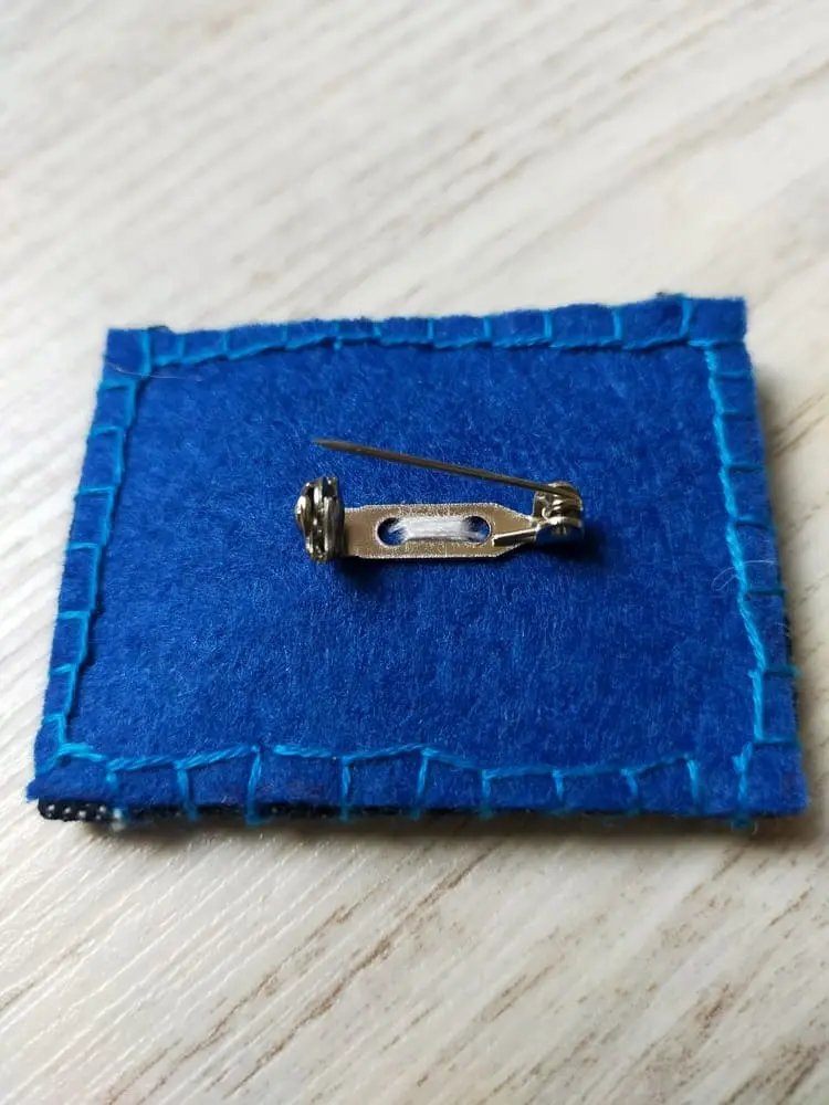 Sur un tissus jeans. L’arrière est en feutrine bleue avec épingle à cran de sureté.