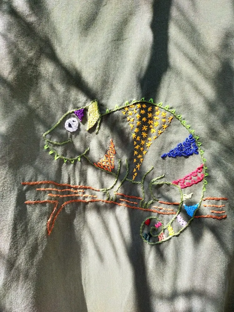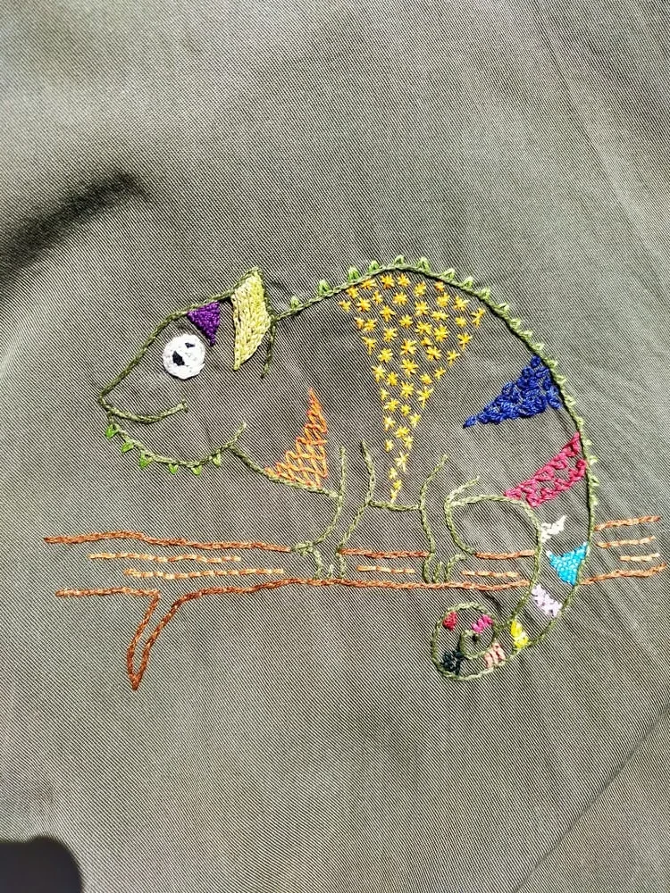 Broderie à la main « Pablo le Caméléon » sur chemise kaki légère type bombers de seconde main.